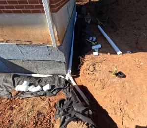Next, we installed a new footing drain system at the base of the foundation to efficiently capture and redirect groundwater. To handle roof runoff, our team connected the downspouts to new PVC discharge lines that carry water safely away from the home’s foundation. This dual system combining footing drains and roof drainage ensures that both surface and subsurface water are managed properly.